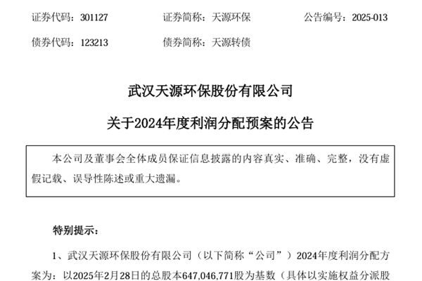 武汉天源环保股份有限公司(简称:天源环保)近日发布《关于2024年度利润分配预案的公告》,确定: 以2025年2月28日的总股本647,046,771股为基数(具体以实施权益分派股权登记日的总股本为基数分配),每10股派发现金红利1.0元(含税),预计派发现金64,704,677.10元(含税),不进行资本公积转增股本,不送红股,剩...