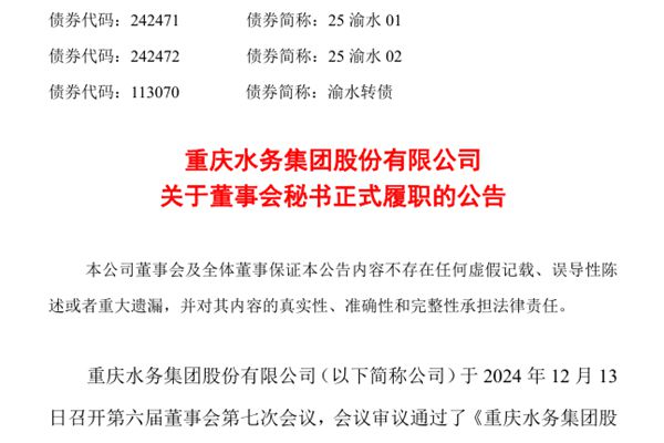 3月18日,重庆水务集团股份有限公司(简称:重庆水务)公告称,郭剑先生已参加上海证券交易所2025年第一期主板上市公司董事会秘书任职培训,并已取得了董事会秘书任职培训证明。郭剑先生自取得主板上市公司董事会秘书任职培训证明之日起正式履行公司董事会秘书职责,公司董事长郑如彬先生不再代行董事会秘书职责。图源:重庆水务 申明:本站发布此信息...