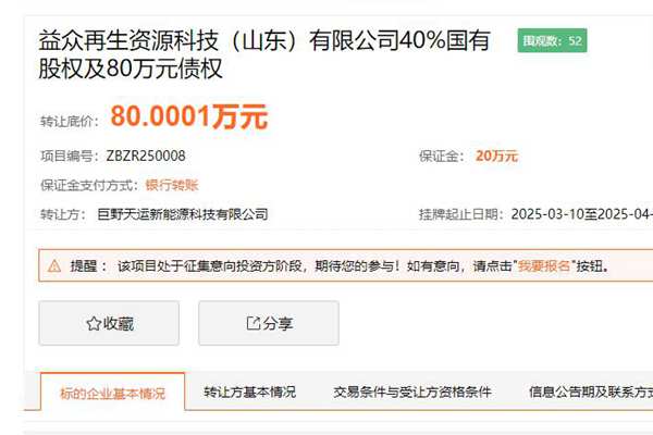 3月10日,据山东省产权交易中心消息,益众再生资源科技(山东)有限公司(下称“标的公司”)40%国有股权及80万元债权近日正式挂牌转让,起止日期为3月10日至4月7日,转让底价80万元,不接受联合体受让。转让方为巨野天运新能源科技有限公司,隶属于菏泽交通集团有限公司。 标的公司成立于2023年2月28日,注册...