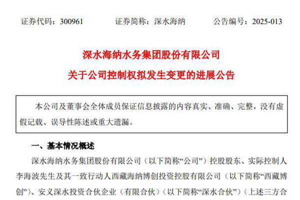 深水海纳水务集团股份有限公司(简称:深水海纳)近日公告称,3月5日,公司控股股东、实际控制人李海波先生及其一致行动人西藏海纳博创投资控股有限公司、安义深水投资合伙企业(有限合伙)(三方合称为“转让方”)与茂名市发展集团有限公司(下称“茂名发展集团”)签署了《备忘录(二)》,就本次交易的订...