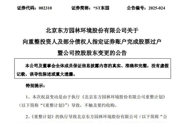 北京东方园林环境股份有限公司(简称:*ST东园,下称:东方园林)近日公告称,公司控股股东由北京朝汇鑫企业管理有限公司(以下简称“朝汇鑫”)变为北京朝阳国有资本运营管理有限公司(以下简称“朝阳国资公司”)。朝阳国资公司、朝汇鑫及北京朝投发投资管理有限公司-北京市盈润汇民基金管理中心(有限合...