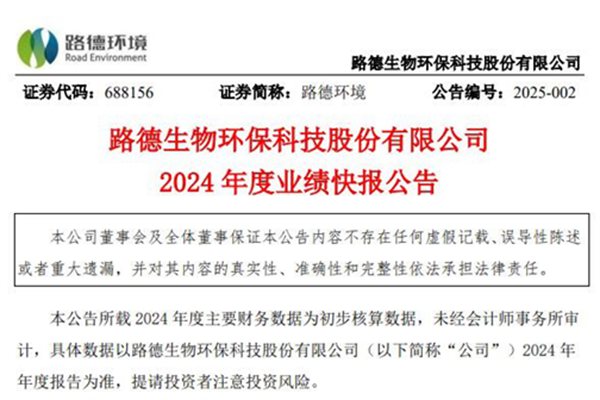 路德生物环保科技股份有限公司(简称:路德环境)近日发布《2024年度业绩快报公告》。公告显示,2024年,路德环境营业总收入为2.82亿元,较上年同期下降19.65%;营业利润为-7821万元,同比下降327.28%;利润总额为-7776万元,同比下降329.68%;归母净利润约亏损5693万元,同比下降311.1%;扣除非经常性损益...