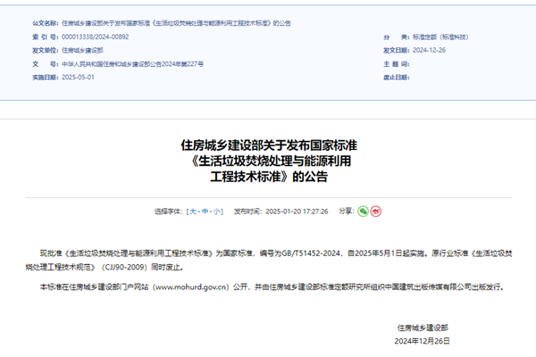 从住建部网站获悉,由中国城市建设研究院有限公司等牵头主编,江苏华星东方环保科技有限公司等17家单位联合参编的《生活垃圾焚烧处理与能源利用工程技术标准》(GB/T51452-2024)(以下简称标准)已获批成为国家标准,将于今年5月1日起实施。 此标准是华星东方参与编纂并成功获批的又一重要技术标准,它的发布与实施将取代原有的行业标准《...