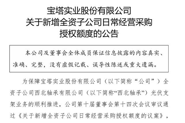 2025年02月25日,宝塔实业股份有限公司发布《关于新增全资子公司日常经营采购》。图源:宝塔实业公告 公司全资子公司西北轴承预计采购光伏支架及螺旋地桩制作业务相关的原材料等采购金额累计不超过2亿元,截至公告披露日,西北轴承已签订光伏支架采购合同金额累计 19,976.11 万元。 对公司的影响 本次新增光伏支架日常经营采购授权...