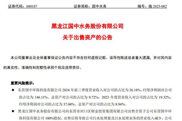 黑龙江国中水务股份有限公司(简称:国中水务)2月12日公告称,公司将向东营市河口区财金投资集团有限公司出售全资子公司东营国中环保科技有限公司(下称“国中环保科技”)100%股权,交易价格为 338,000,000.00元,出售后将导致公司污水处理量及污水处理业务的营业收入减少。 业绩方面,国中环保科技 202...