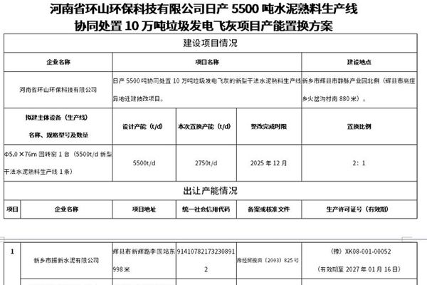 2月11日,河南省工业和信息化厅发布《关于河南省环山环保科技有限公司日产5500吨水泥熟料生产线协同处置10万吨垃圾发电飞灰项目产能置换方案的公告》称: 根据第三轮中央生态环境保护督察反馈意见及河南省整改方案有关要求,依据新乡市工业和信息化局报告文件,河南省环山环保科技有限公司拟分阶段按照2:1比例对日产5500吨水泥熟料生产线协同...