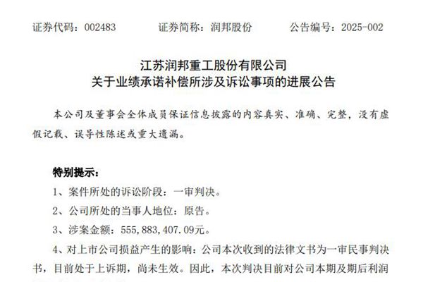 1月26日,江苏润邦重工股份有限公司(简称:润邦股份)发布公告,公司因与业绩补偿义务人王春山的合同纠纷,向江苏省南通市中级人民法院提起诉讼,诉请王春山支付2023年度的业绩补偿款合计5.56亿元,并要求支付逾期付款的违约金。近期,公司收到了一审民事判决书,判决王春山需在判决生效后十日内支付上述业绩补偿款,并按照年利率8%计算逾期付款的...