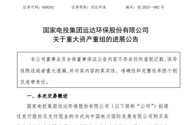 国家电投集团远达环保股份有限公司(简称:远达环保)近日公告称,公司重大资产重组涉及的审计、评估、尽职调查等工作正按照计划开展。待相关工作完成后,公司将再次召开董事会审议本次交易的相关事项。 据悉,远达环保拟通过发行股份及支付现金的方式向中国电力国际发展有限公司购买其持有五凌电力有限公司63%股权、向湖南湘投国际投资有限公司购买其持有...