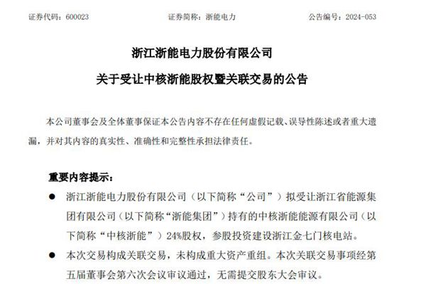 12月20日晚间,浙江浙能电力股份有限公司(简称:浙能电力)发布公告,表示公司拟受让公司控股股东浙江省能源集团有限公司(下称“浙能集团”)持有的中核浙能能源有限公司(简称“中核浙能”)24%股权,参股投资建设浙江金七门核电站,股权转让价款1.16亿元。 金七门核电站位于宁波市象山县,厂...
