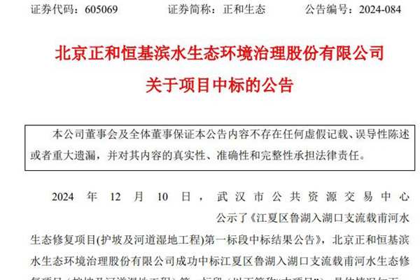 北京正和恒基滨水生态环境治理股份有限公司(简称:正和生态)12月12日公告称,公司成功中标江夏区鲁湖入湖口支流载甫河水生态修复项目(护坡及河道湿地工程)第一标段,中标金额为2,469.515609 万元。 项目招标单位为武汉市江夏区水务和湖泊局,拟对鲁湖入湖口支流载甫河及支流进行水生态治理,通过河道建设生态护岸、恢复河道水生植被、建...
