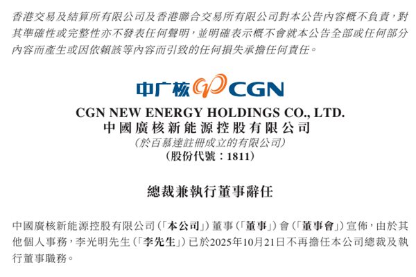 中国广核新能源控股有限公司(简称:中广核新能源)近日公告称,由于其他个人事务,李光明先生(“李先生”)已 于 2025年10月21日不再担任本公司总裁及执行董事职务。 中广核新能源表示,李先生已确认彼与董事会并无意见分歧,亦无其他与其辞任有关的事宜须提请本公司股东或香港联合交易所有限公司垂注。董事会主席兼执行...