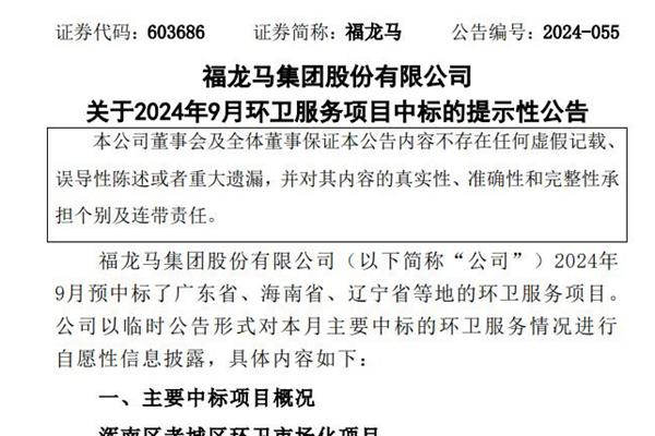 福龙马集团股份有限公司(简称:福龙马)近日发布《关于2024年9月环卫服务项目中标的提示性公告》,9月预中标的环卫服务项目数3个,合计首年服务费金额为17,251.05万元(占公司2023年度经审计营业收入的3.38%);合同总金额为51,365.36万元。 其中,浑南区老城区环卫市场化项目是福龙马2016年中标的浑南区老城区环境卫...