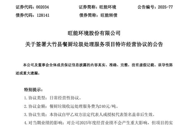 旺能环境股份有限公司(简称:旺能环境)近日公告称,公司与大竹县人民政府签署了《大竹县垃圾处理服务协议之补充协议(餐厨垃圾处理服务项目)》,明确由浙江旺能的全资子公司浙江旺能生态科技有限公司在渠县注册成立项目公司,由新设的项目公司在合作期内承担大竹县餐厨垃圾处理服务项目的投融资、设计、建设、运营、维护等。协议金额:餐厨垃圾收运处理服务费...