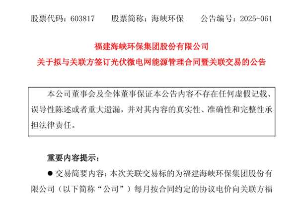 福建海峡环保集团股份有限公司(简称:海峡环保)公告称,公司拟与控股股东福州水务集团有限公司全资子公司福州海峡水业有限公司(下称“海峡水业”)签署《福州市洋里污水处理厂光伏微电网能源管理项目合作合同》,合作期限为自项目运营起始日起三年,预计每年发生的关联交易金额不超过700万元(含税),合作期限内预计发生的关联交...