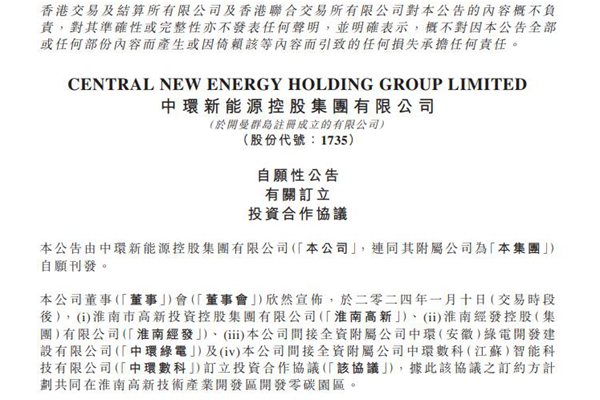 近日,中环新能源控股集团有限公司(简称:中环新能源)发布公告称,2024年1月10日,淮南市高新投资控股集团有限公司、淮南经发控股(集团)有限公司、公司间接全资附属公司中环(安徽)绿电开发建设有限公司(简称“中环绿电”)及公司间接全资附属公司中环数科(江苏)智能科技有限公司(简称“中环数科&rdqu...