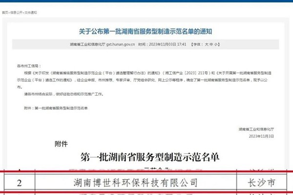 近日,湖南省工业和信息化厅发布《关于公布第一批湖南省服务型制造示范名单的通知》,湖南博世科上榜示范企业名单,充分展现了公司作为拥有核心技术的综合环境服务提供商的服务能力,企业核心竞争力得到进一步提升。 服务型制造是一种制造与服务深度融合、协同发展的新型产业形态。在这种形态下,企业从传统以加工组装产品为中心逐渐向基于产品价值链,为客户...