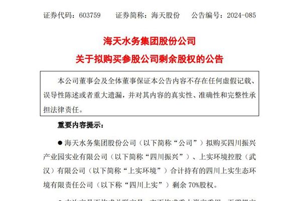海天水务集团股份公司(简称:海天股份)近日公告称,拟收购四川上实生态环境有限责任公司(下“上实环境”)剩余70%股权,现由四川振兴产业园实业有限公司、上实环境控股(武汉)有限公司合计持有。 据悉,2024年9月25日,海天股份与世丰国际投资有限公司签订了《股权购买协议》,购买其所持有的上实环境30%股权,目前...