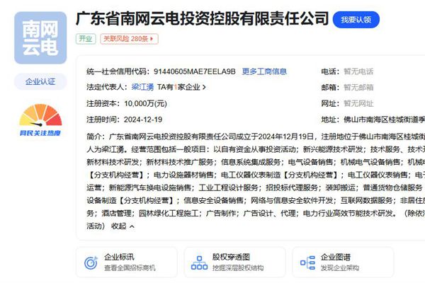 12月19日,广东省南网云电投资控股有限责任公司正式注册成立,法定代表人为梁江湧,注册资本10000万人民币。经营范围如下↓ 一般项目:以自有资金从事投资活动;新兴能源技术研发;技术服务、技术开发、技术咨询、技术交流、技术转让、技术推广;新材料技术研发;新材料技术推广服务;信息系统集成服务;电气设备销售;机械电气设备销售;...
