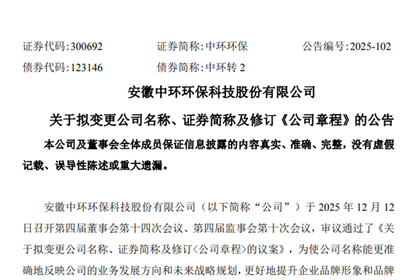 业务涵盖环保设备制造销售、垃圾污水无害化处理、环保科技研发应用三大板块的安徽中环环保科技股份有限公司《关于拟变更公司名称、证券简称及修订的公告》近日发布,公告显示,公司于2025 年12 月12日召开第四届董事会第十四次会议、第四届监事会第十次会议,审议通过了《关于拟变更公司名称、证券简称及修订的议案》,,为使公司名称能更准确地反映公...