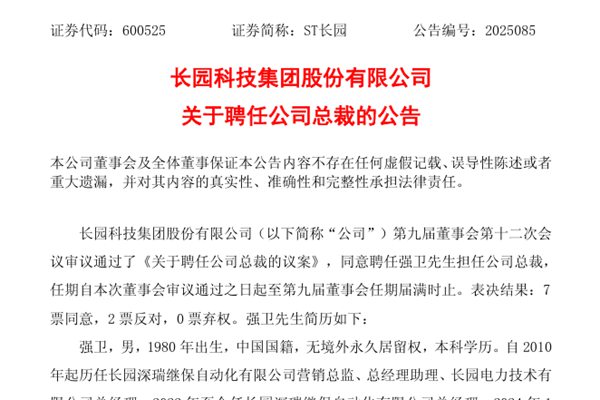 9月30日,长园科技集团股份有限公司(简称:ST长园)发布关于聘任公司总裁的公告,经过第九届董事会第十二次会议审议通过了《关于聘任公司总裁的议案》,同意聘任强卫先生担任公司总裁,任期自本次董事会审议通过之日起至第九届董事会任期届满时止。 强卫,男,1980年出生,中国国籍,无境外永久居留权,本科学历。自2010年起历任长园深瑞继保自...