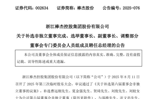 8月12日,浙江棒杰控股集团股份有限公司(简称:棒杰股份)发布公告称,公司审议通过了《关于补选第六届董事会非独立董事的议案》,补选曹远刚先生、夏金强先生、贺琦先生、刘俊先生、刘姣女士为公司第六届董事会非独立董事,与郑维先生、沈文忠先生、孙建辉先生、章贵桥先生共同组成公司第六届董事会。任期自股东会审议通过之日起至第六届董事会任期届满之日...