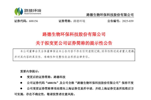 路德生物环保科技股份有限公司(简称:路德环境)近日公告称,公司第五届董事会第五次会议审议通过了《关于拟变更公司证券简称的议案》,同意将公司证券简称由“路德环境”变更为“路德科技”,公司全称和证券代码保持不变。本次拟变更证券简称事项无需提交公司股东会审议。 路德环境表示,更名后,更加契合...