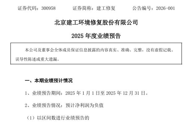 近日,北京建工环境修复股份有限公司(简称:建工修复)发布《2025年度业绩预告》。报告期内,建工修复预计实现归属于上市公司股东的净利润亏损6800万元至8800万元,上年同期亏损5,339.32万元;扣除非经常性损益后的净利润亏损7300万元至9400万元,上年同期亏损6611.67万元。图源:建工修复公告 建工修复表示,报告期内业...